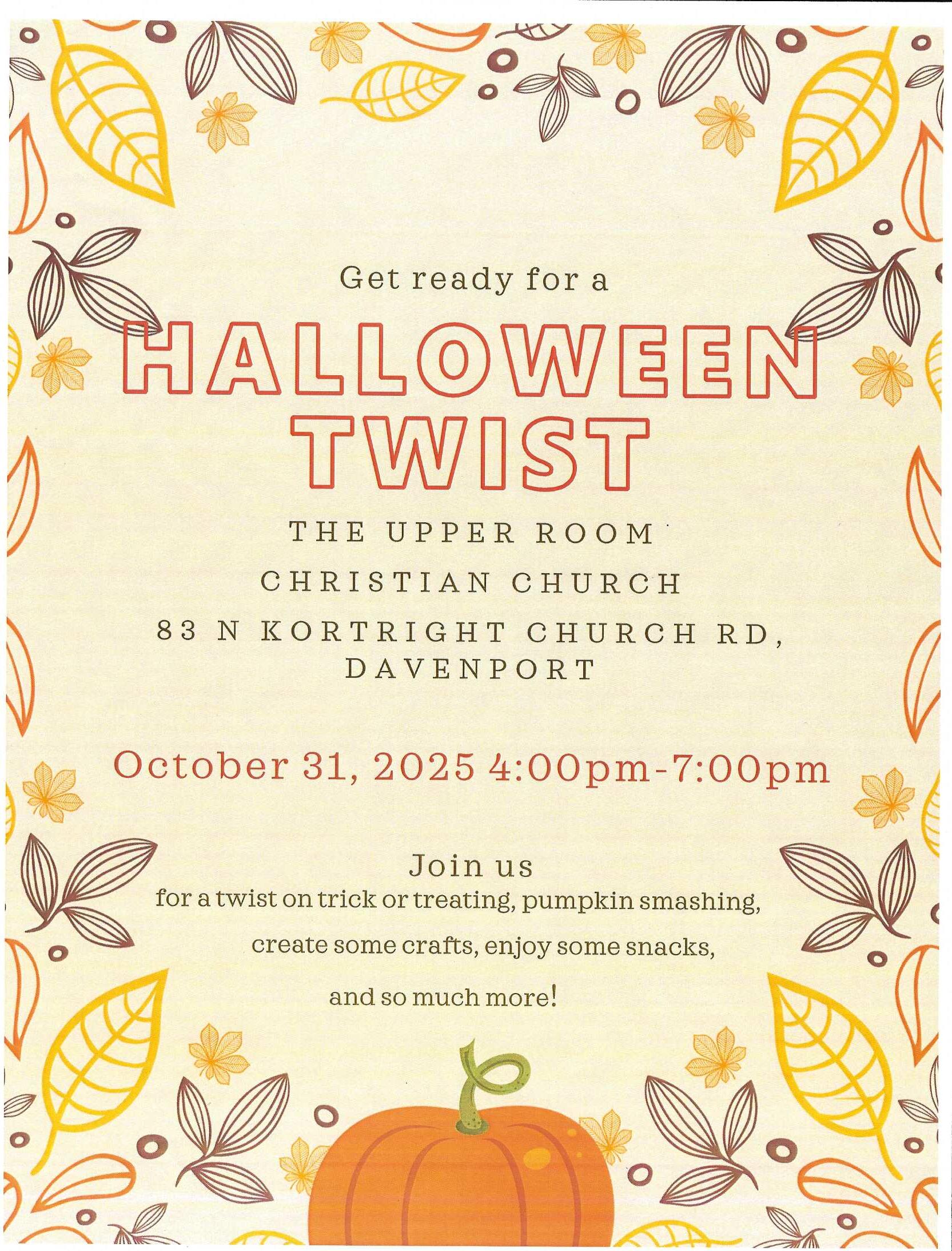 Get ready for a Halloween TWIST. Come to THE UPPER ROOM CHRISTIAN CHURCH, located at 83 North Kortright Church Rd, Davenport, NY to Knock on Doors of Old. Let the Bible characters behind those doors give you a treat and a story that will bless your Halloween experience with Joy.