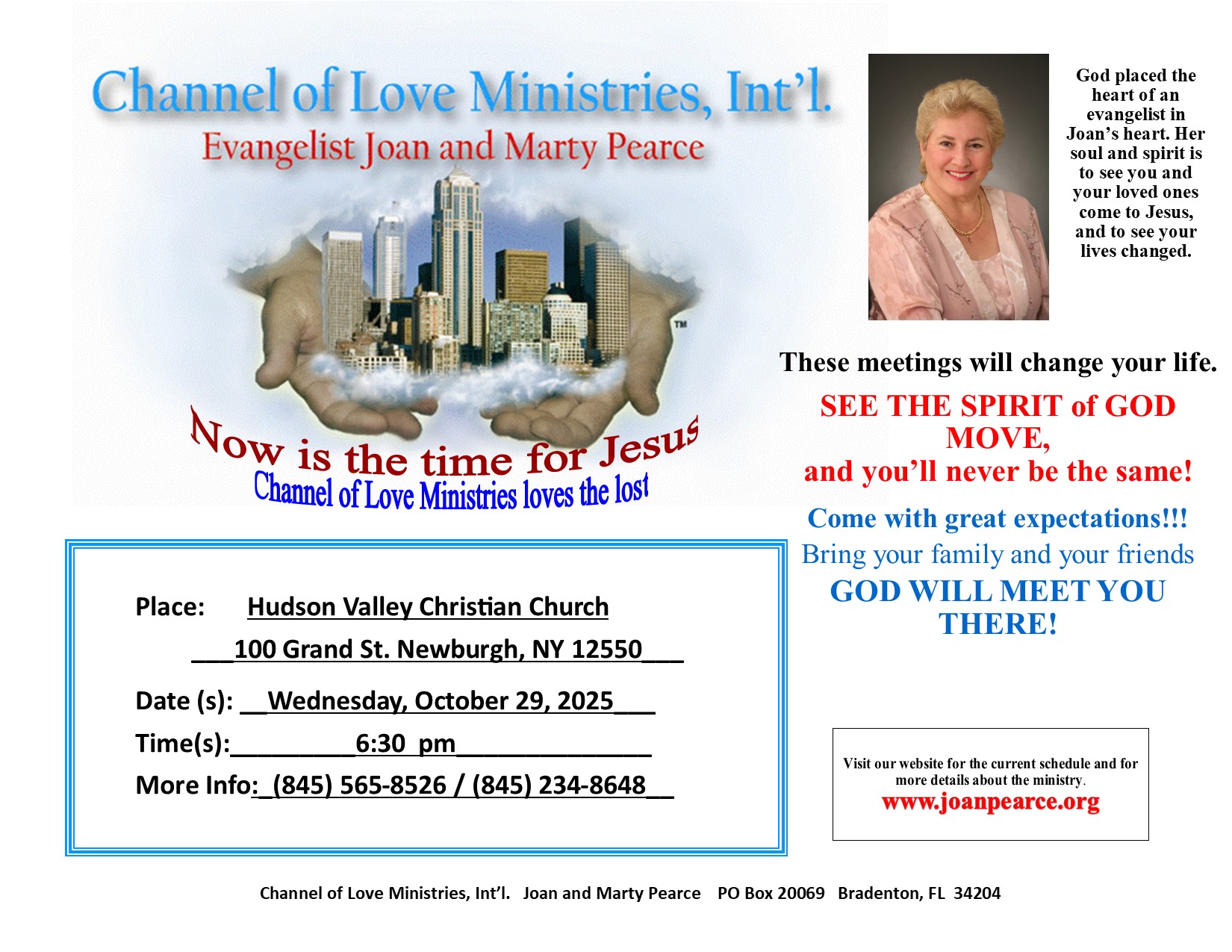 Hudson Valley Christian Church will be Hosting Evangelist Joan Pearce Wednesday, October 29, 2025 at 6:30 pm. The location is 100 Grand Street Newburgh, NY 12550